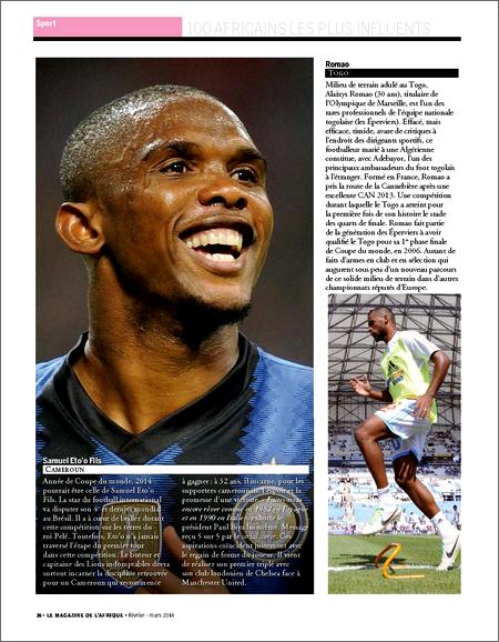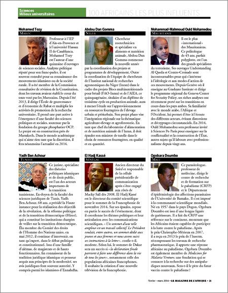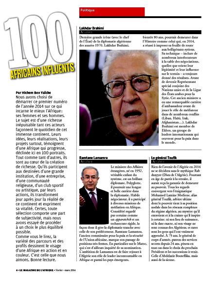 On y retrouve aussi les marocains Moulaye Hafid Elalamy, patron du groupe Sahan et ministre de l’Industrie et des Nouvelles technologies de son pays depuis octobre 2013 et Oumar Azziman conseiller du roi Mohamed VI. A coté de ces deux personnalités trônent le Burkinabé Arsène Begnossan Yé le fameux ‘’ministre de l’article 37’’ et le Congolais (Brazzaville) André Okombi Salissa qualifié de ‘’Flatteur du Macky Sall du Congo’’ par Hichem Ben Yaïche rédacteur en chef de New African.