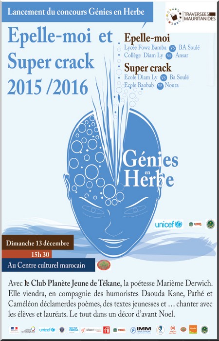 Cette année, la programmation sera très très spéciale avec la poétesse Marième Derwich. Elle viendra, en compagnie de l’humoriste Daouda Kane, déclamer des poèmes, des textes jeunesses et … chanter avec les élèves et lauréats. Le tout dans un décor conçu par les artistes plasticiens mauritaniens. Ne vous faites pas raconter !