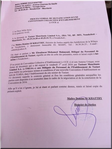 Bien qu’ils soient un peu surpris de ce revirement, les délégués du personnel tout en renouvelant leur disponibilité à participer activement à toute négociation constructive tendant à l’amélioration des conditions de vie et de travail des employés de la mine de Tasiast, ils ont saisi cette occasion pour exposer les revendications des travailleurs que la direction avait suggéré, aux termes du courrier du 12/08/2015, de remettre à plus tard.