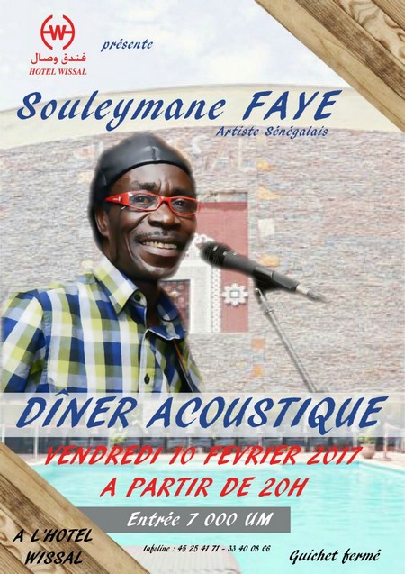 Cridem Culture - Le chanteur sénégalais Souleymane Faye sera en Mauritanie pour une soirée acoustique + dîner le 10 février à l’Hôtel Wissal, à Nouakchott, à partir de 20 heures.