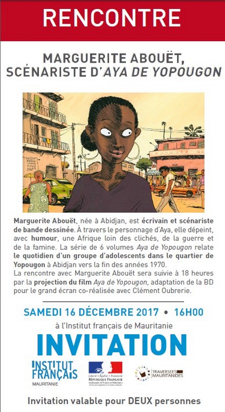 IfM - Samedi 16 décembre à 16 heures, en partenariat avec le Festival Traversée Mauritanides, l’IfM accueille Marguerite Abouët, auteure à succès de bande dessinée. Marguerite Abouët, née à Abidjan, a écrit la BD Aya de Yopougon.