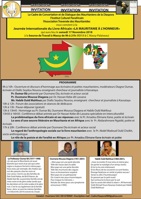 Ousmane Sao - Le Cadre de Concertation et de Dialogue des Mauritaniens de la Diaspora en collaboration avec l’Institut Culturel Panafricain et l’Association Traversée des Mauritanides organisent une journée internationale consacrée au Livre africain et mettent à l’honneur la littérature mauritanienne et sa poésie.