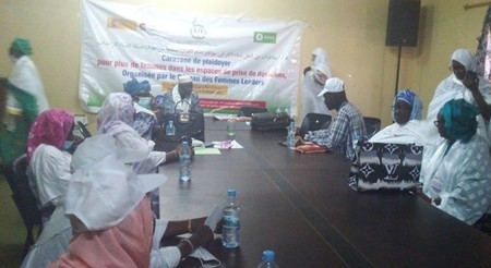 Après cette conférence, les dames leaders ont marché en direction de la Mougataa, tenant une géante banderole sur laquelle on pouvait lire : caravane de plaidoyer pour plus de femmes dans les espaces de prise de décision organisé par les femmes leaders afin de deposer leur note de plaidoyer. Le Hakem, trouvé sur place et tiré à quatre épingles est sorti les accueillir.