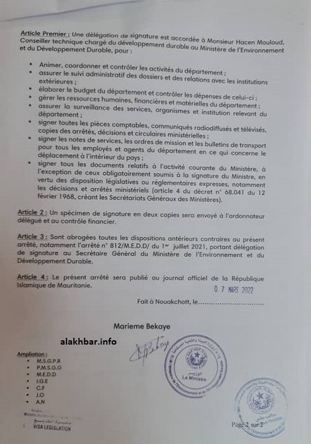 Adrar Info - La ministre de l’Environnement et du Développement durable, Mariem Bekaye, a retiré les pouvoirs de signature au secrétaire général du ministère ,maire de la commune de Rkiz Mohamed Ould Ahmedoua, après l’escalade du différend qui les oppose au cours de la période récente.